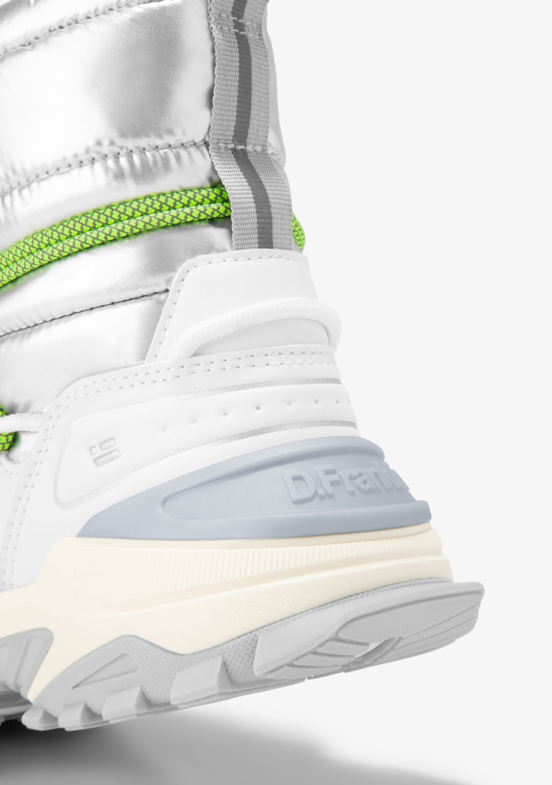High-cut design crafted with flexible and lightweight materials. This design features a padded finish in silver tones with green multi-position laces. It showcases our flag and lettering on both the heel and front, as well as an adjustable closure at the top.
