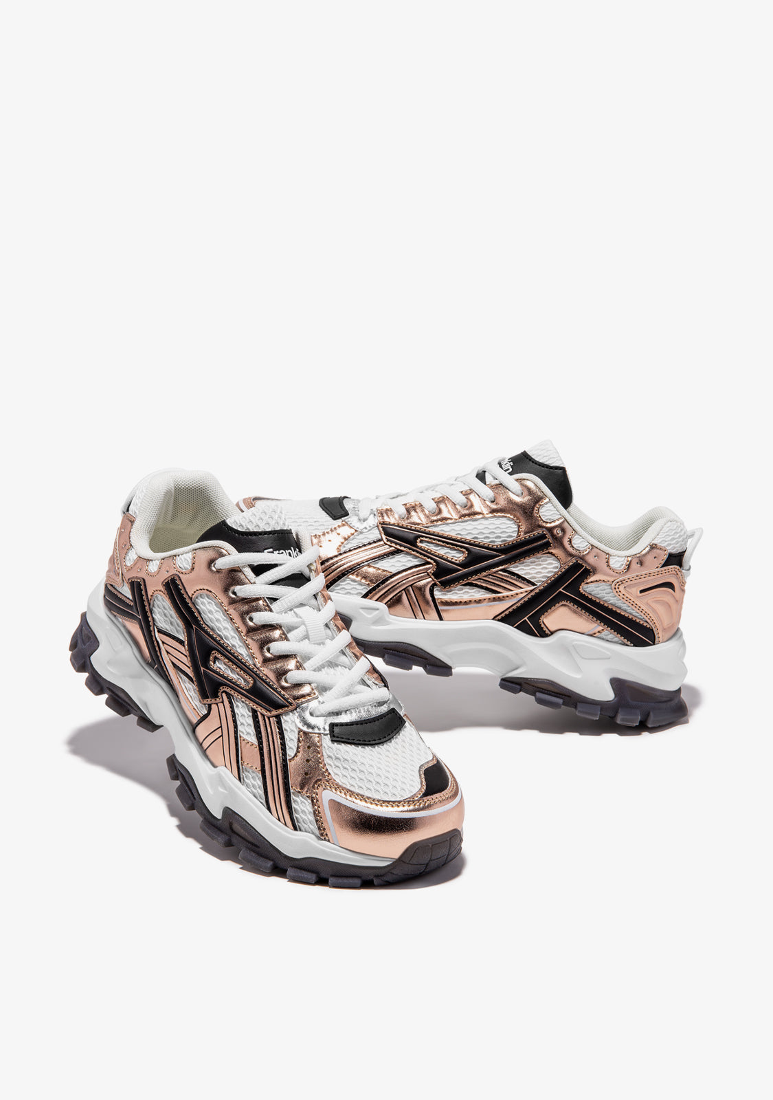 Our 347 has the ultimate chunky essence. Its heavyweight nylon mesh is combined with different finishes and shades of white, gold and black. It features our emblem on the front. And the signature dual-density TR sole contrasts with the colour of the design for added cushioning.