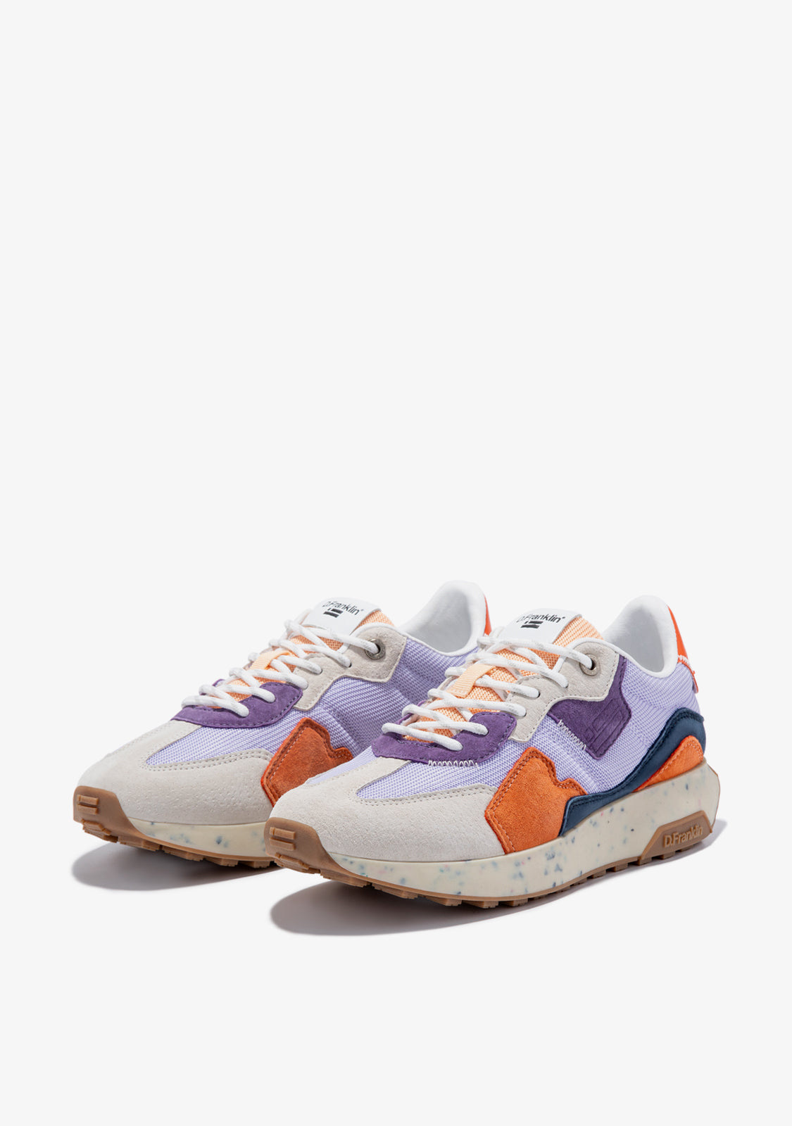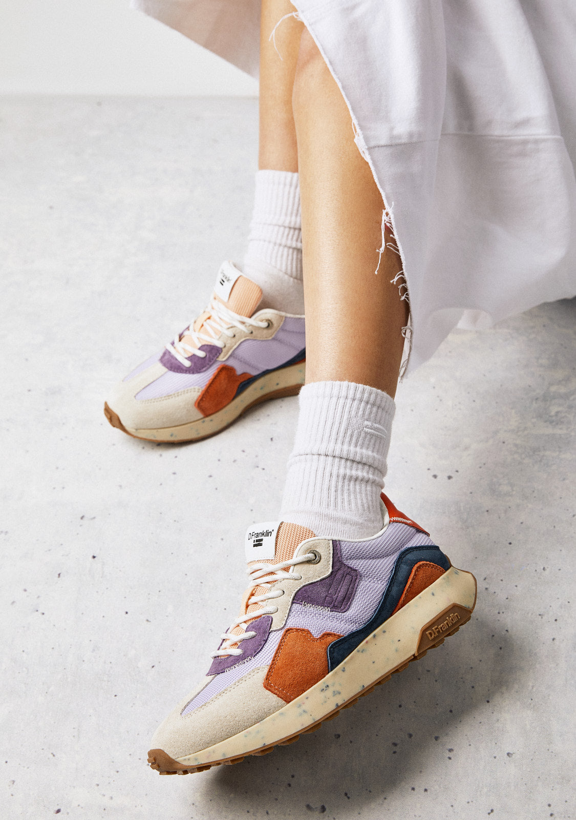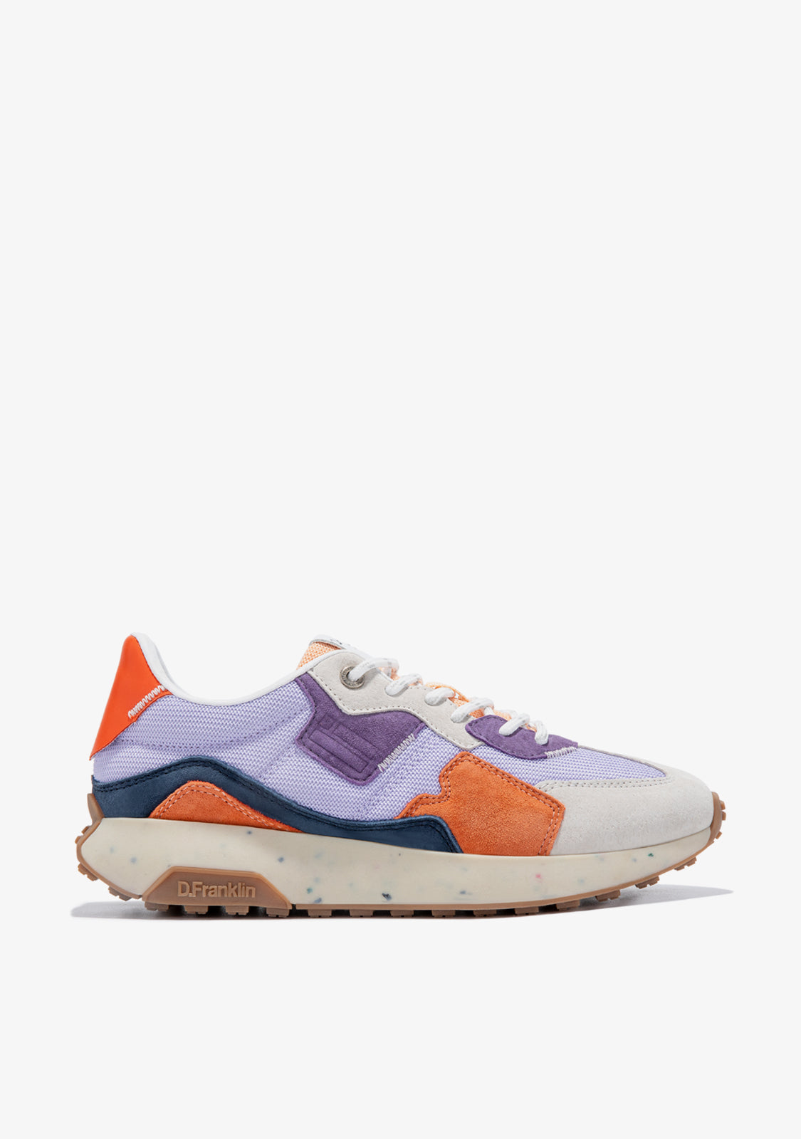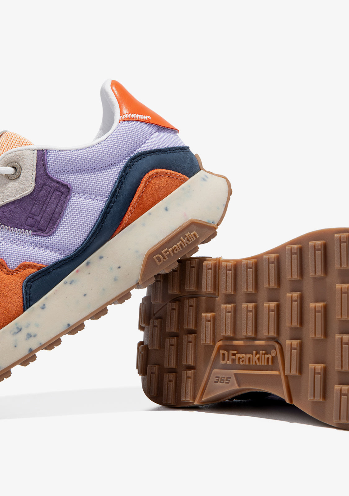 This model combines orange, grey and mauve tones in a design that stands out for its uniqueness. It features a D.Franklin flag on the side and lace-up detailing for a perfect fit. In addition, it has a two-density sole. The first one is made of recycled materials for a comfortable and light tread, and the second one is embossed to provide grip.