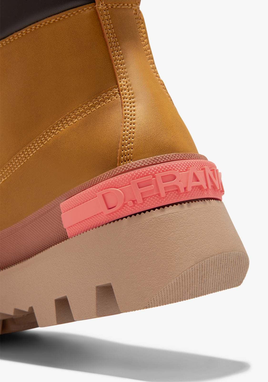 This D.Franklin model in tan features a trail-style laces. Its track-style sole provides unmatched grip. It also features our logo and emblem embossed on the wedge and toe.