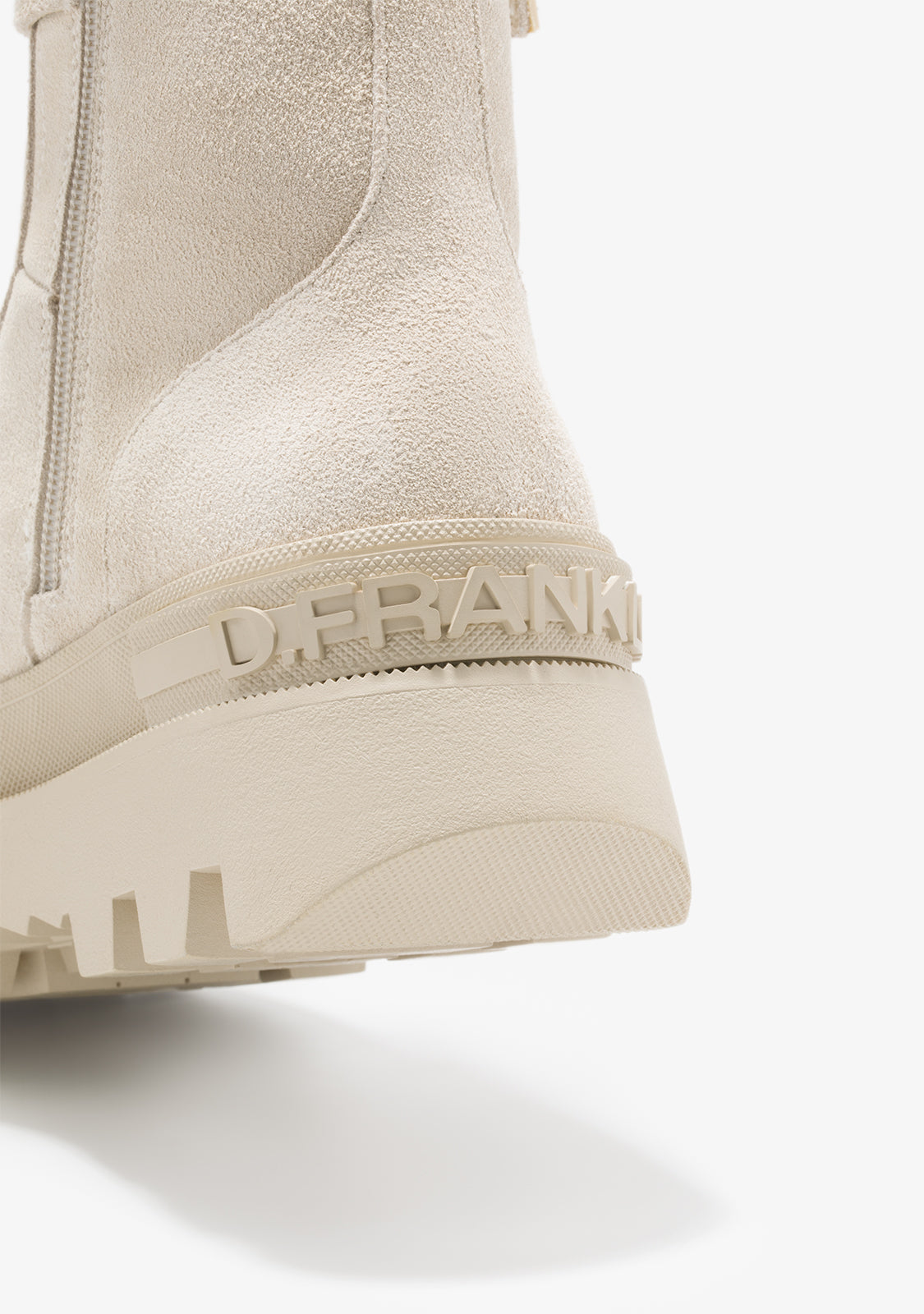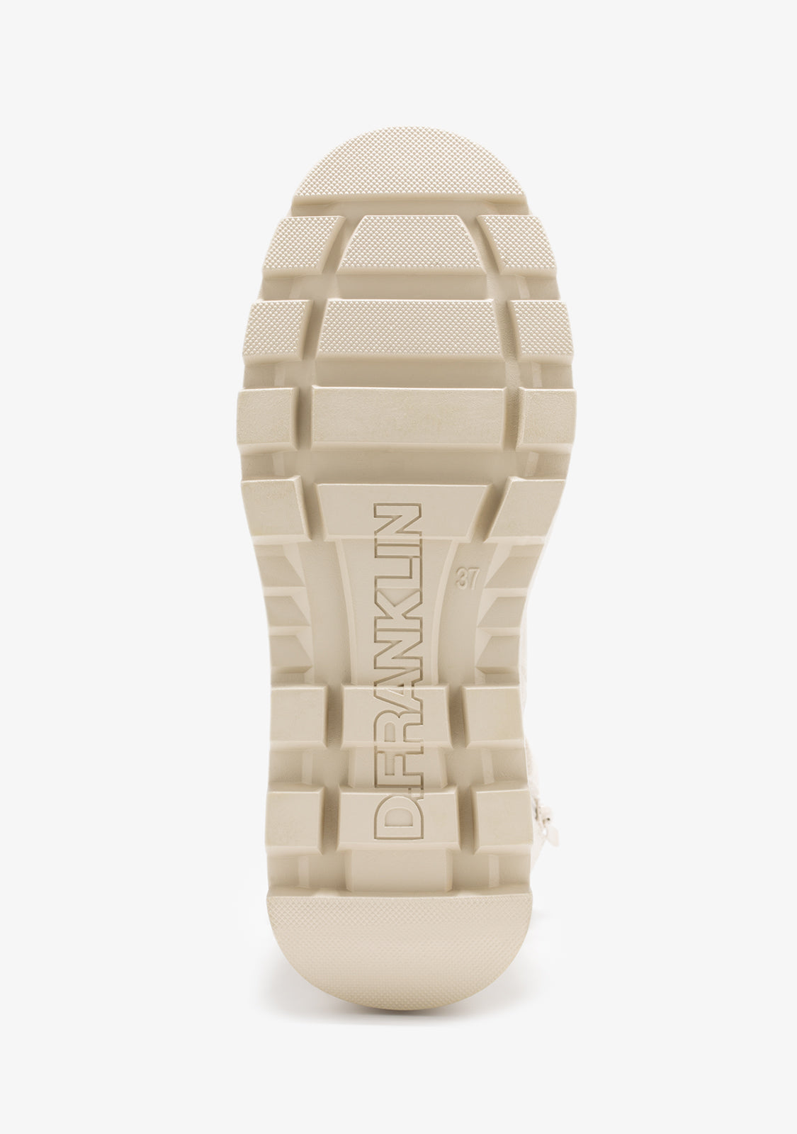 This D.Franklin model in beige features an inner zipper on one side and adjustable cotton laces. Its track-style sole provides unmatched grip. It also features our logo and emblem embossed on the wedge and toe.