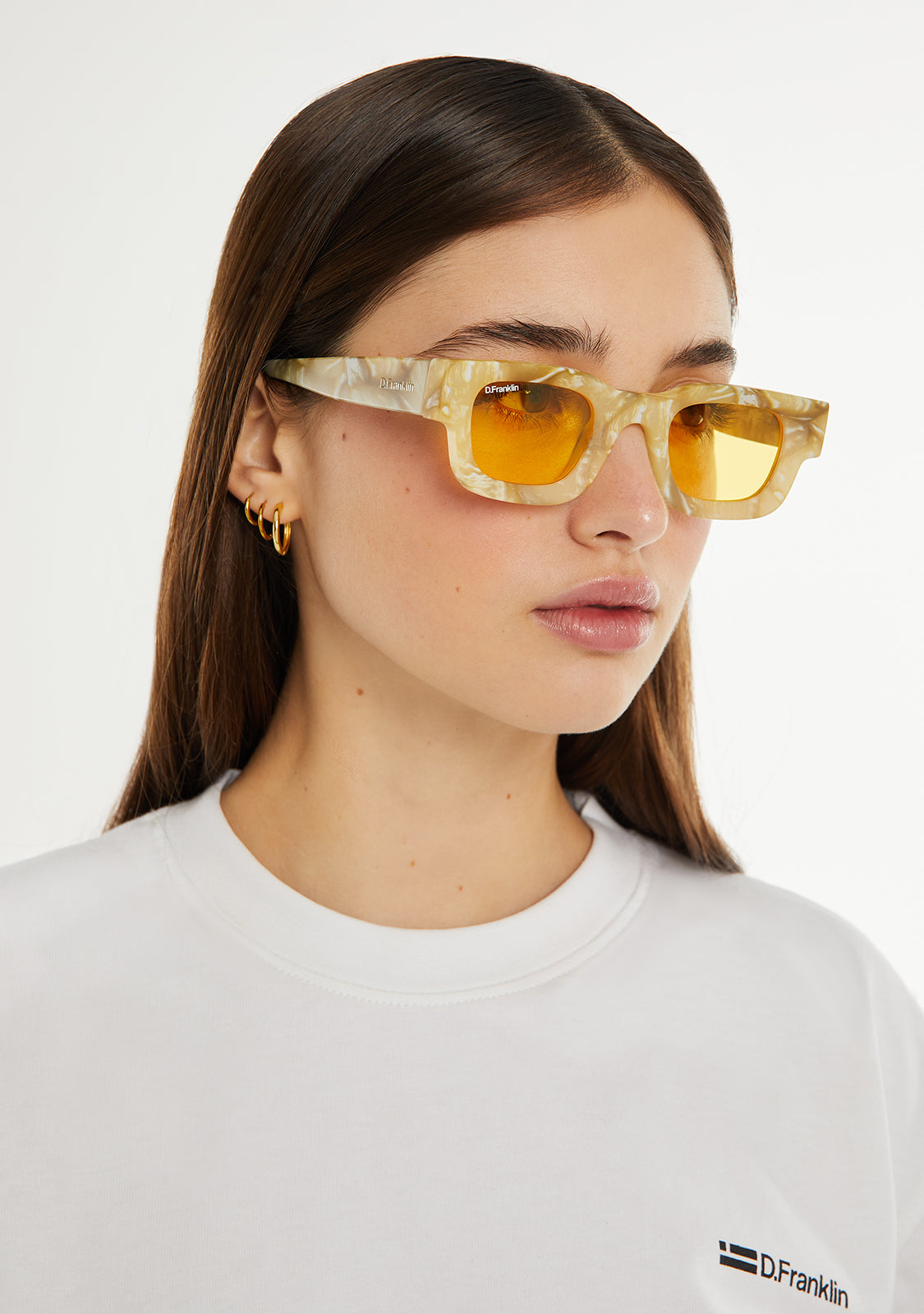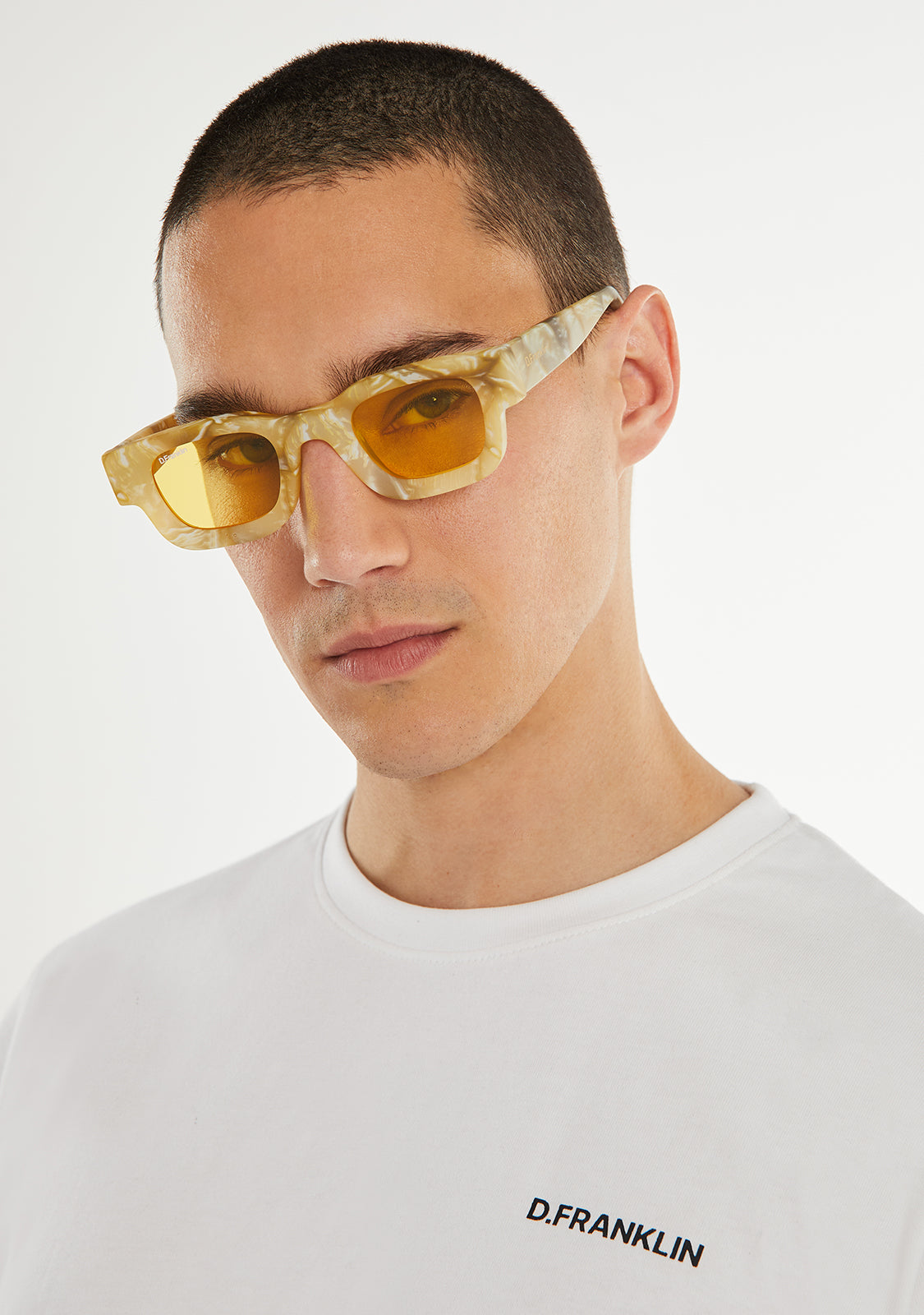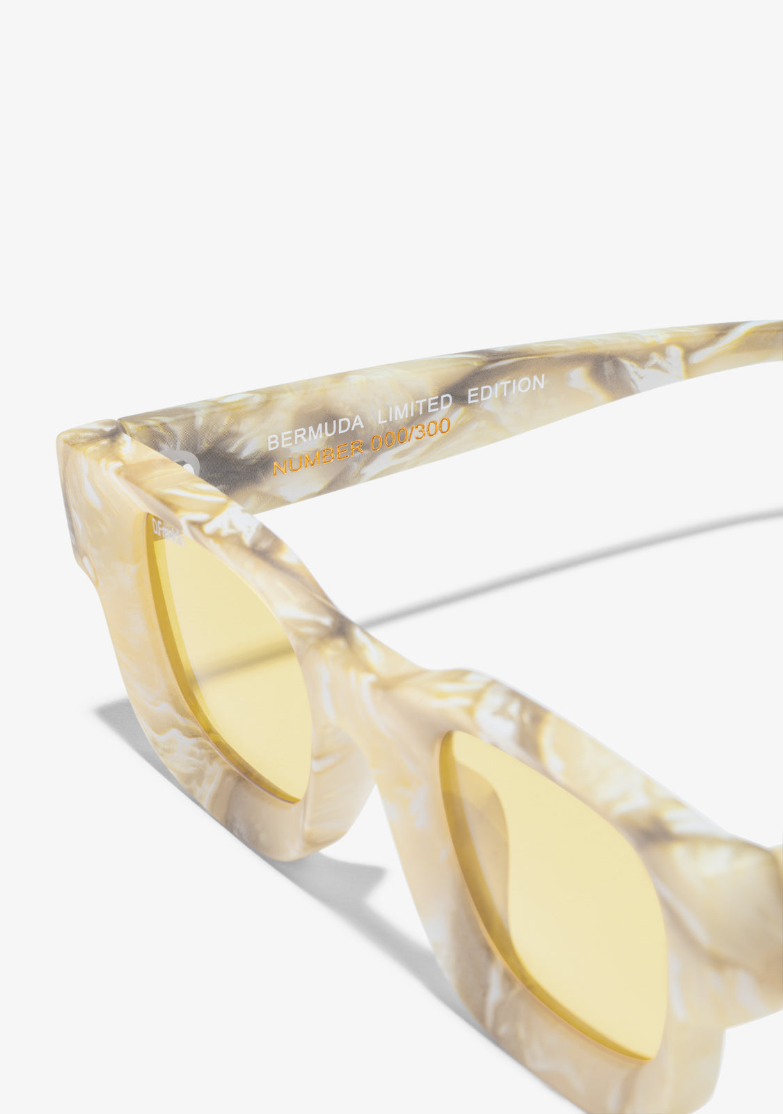 Bermuda White Stone is a matte finish design made from materials inspired by white marble. Thick frames and yellow lenses represent our different prisms, framed in an oversized rectangular silhouette specially designed to interact with new spaces.