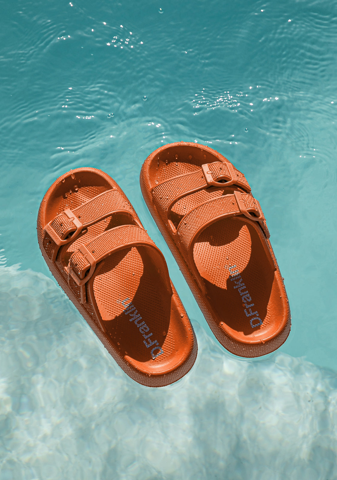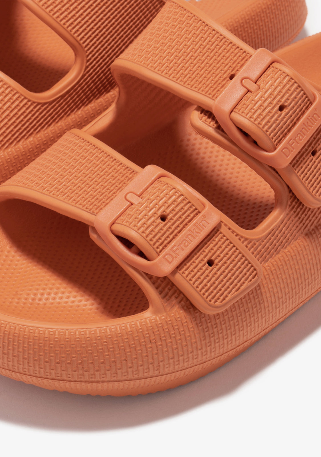 Inspired by the sunset tones of South Beach, Miami. Made with EVA for a lightweight feel. Designed with a rounded silhouette and double buckle closure in orange. D.Franklin logo on the sole. Bloomer Bio sandals run slightly small. We recommend choosing one size larger than your usual size.