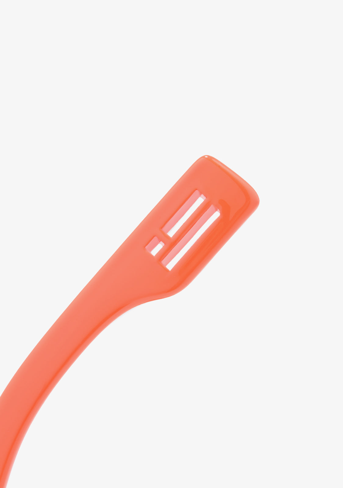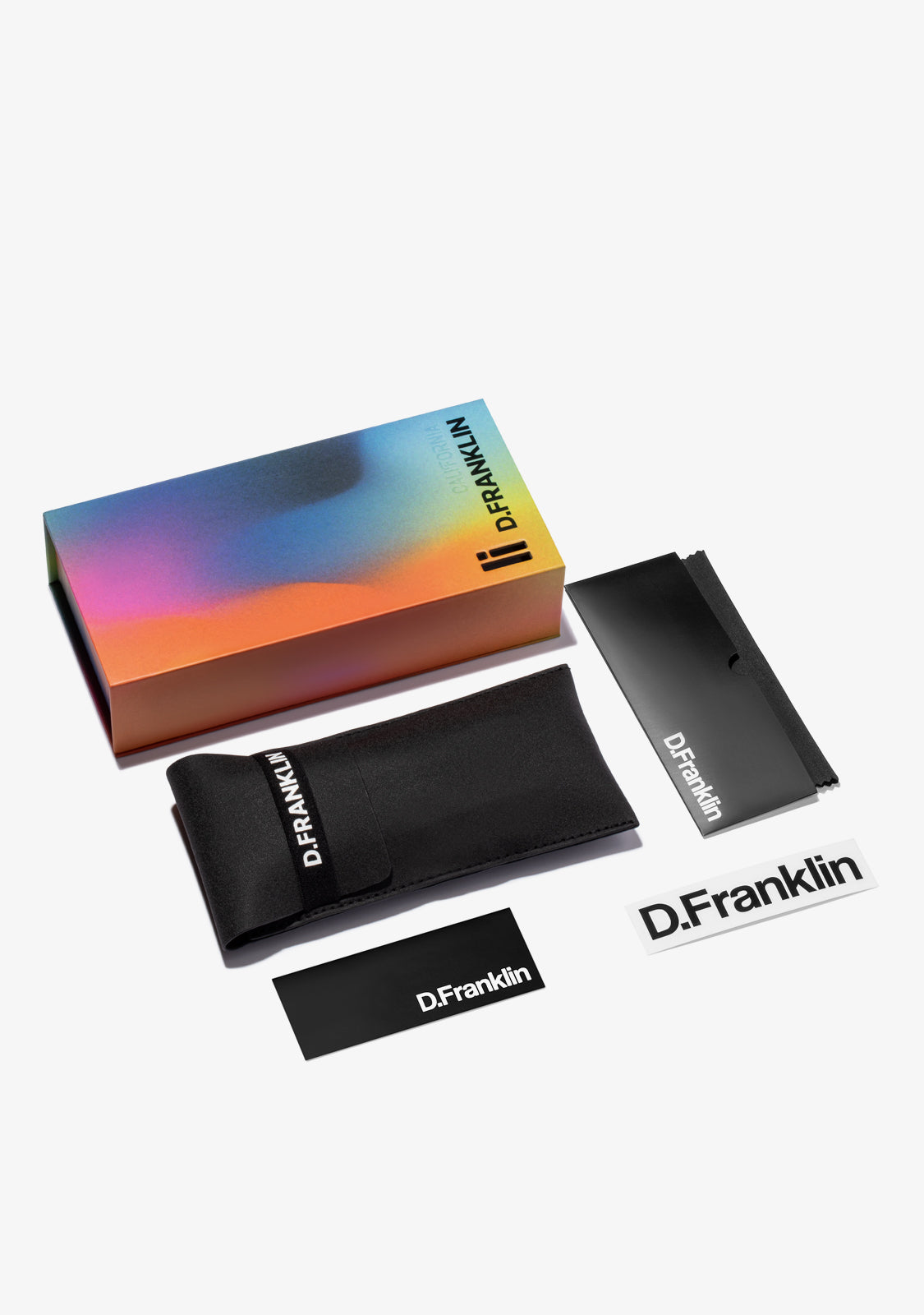 D.Franklin California sunglasses. A model designed in orange tones and vibrant details. Created with our signature D.Franklin details: logo engraved on both temples and emblem on the right lens. The lens width is 57 mm and the front lens width is 148 mm. Side temples are 145 mm long.