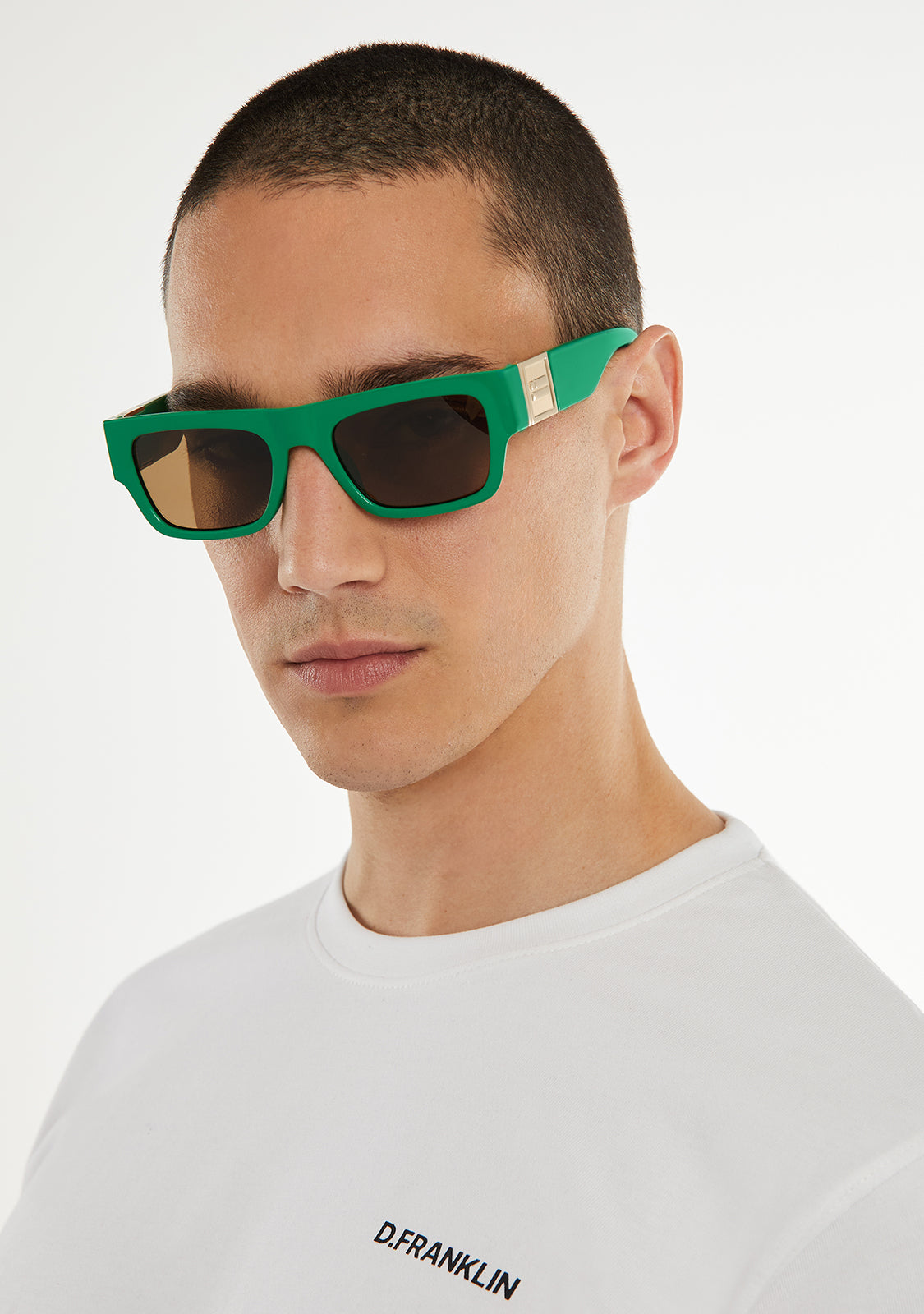 Smoked polarized lenses and a green frame enhance the aesthetics of this design. It features our signature D.Franklin flag with a metallic gold finish on both temples. With a lens width of 52mm and a 141mm front frame, these glasses will flatter most faces. The side temples have a length of 140 mm.