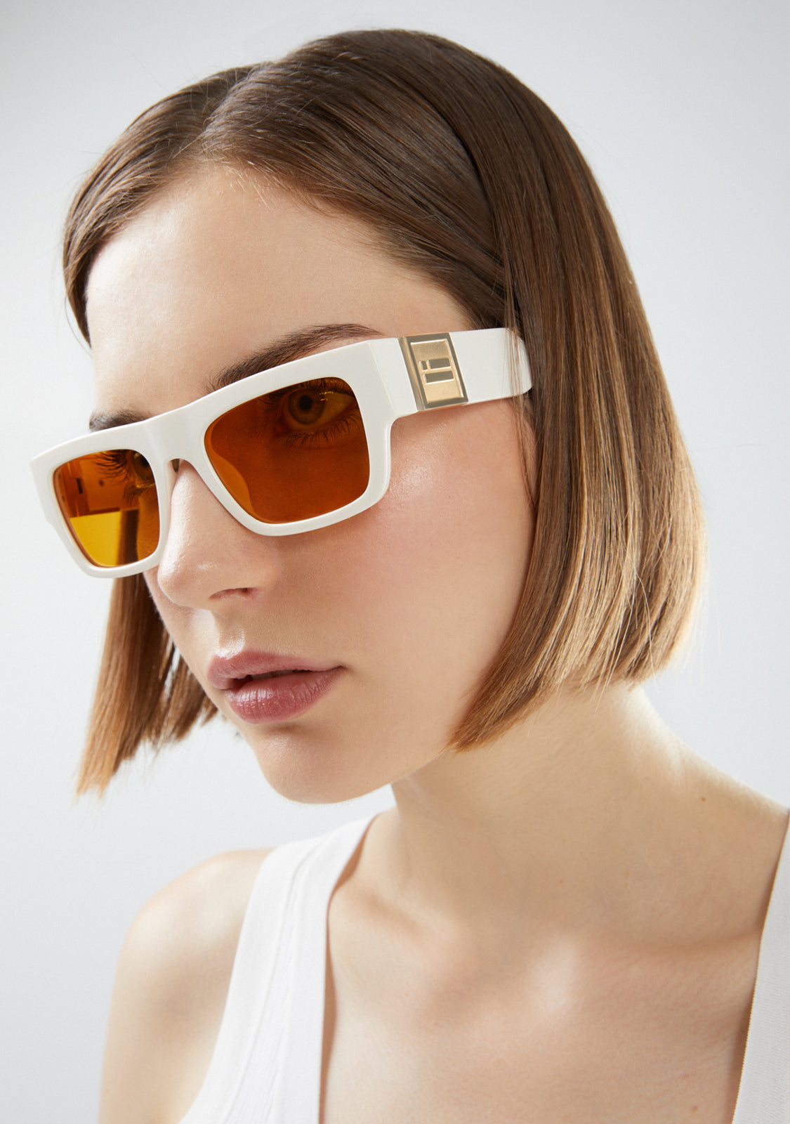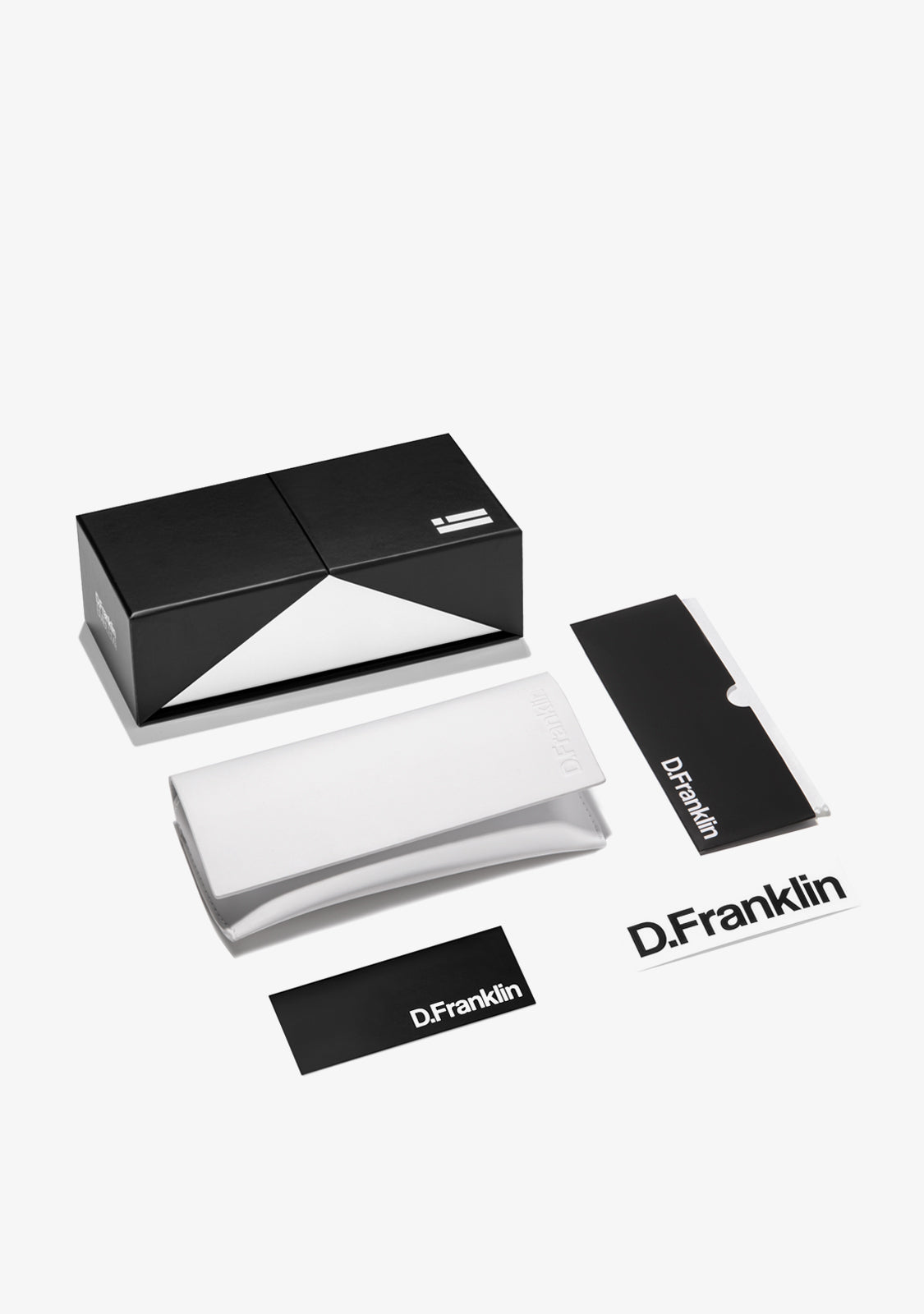 Yellow polarised lenses and white frames enhance the aesthetics of this design. It features our signature D.Franklin flag with a metallic gold finish on both temples. With a lens width of 52mm and a 141mm front frame, these glasses will flatter most faces. The side temples have a length of 140 mm.