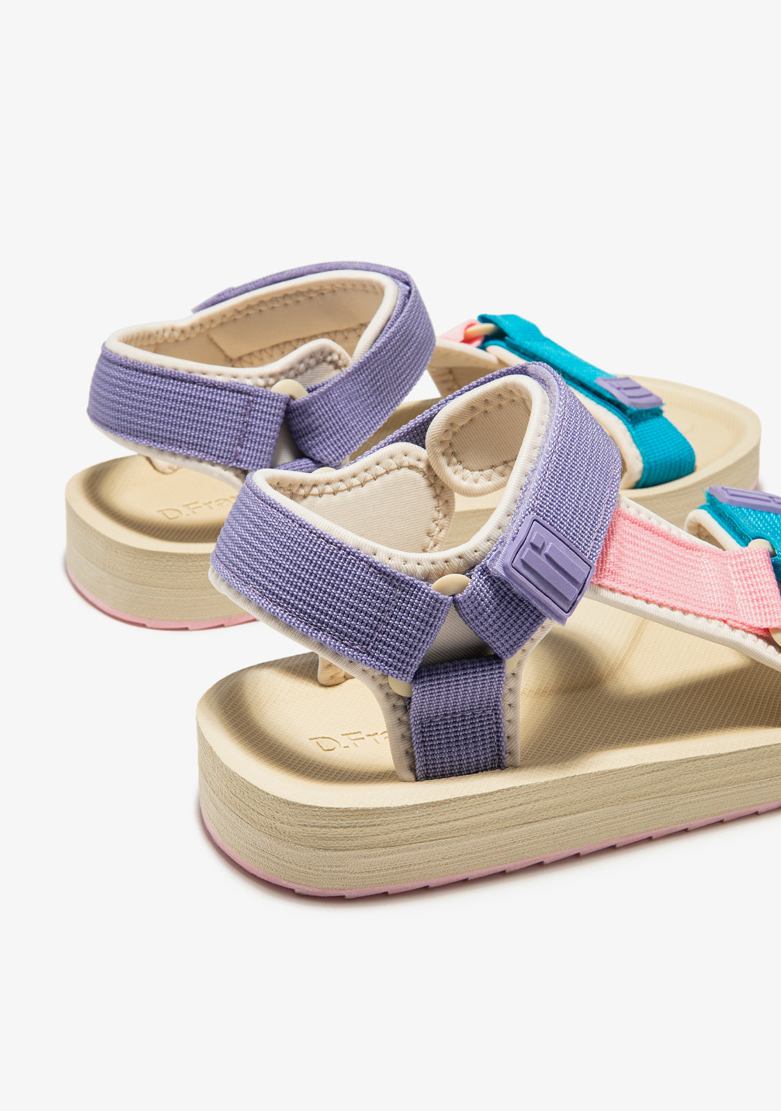 Inspired by days spent outdoors. This design features triangular buckle fastenings and a rip-tab fastening. It has a new cyan, pink and purple finish. Featuring D.Franklin branding on both the sole and side.