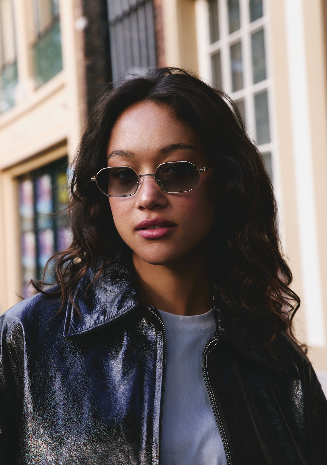 Translucent sunglasses with a geometric design. The legacy of the most iconic pieces from the 70s is combined with a selection of modern details.
