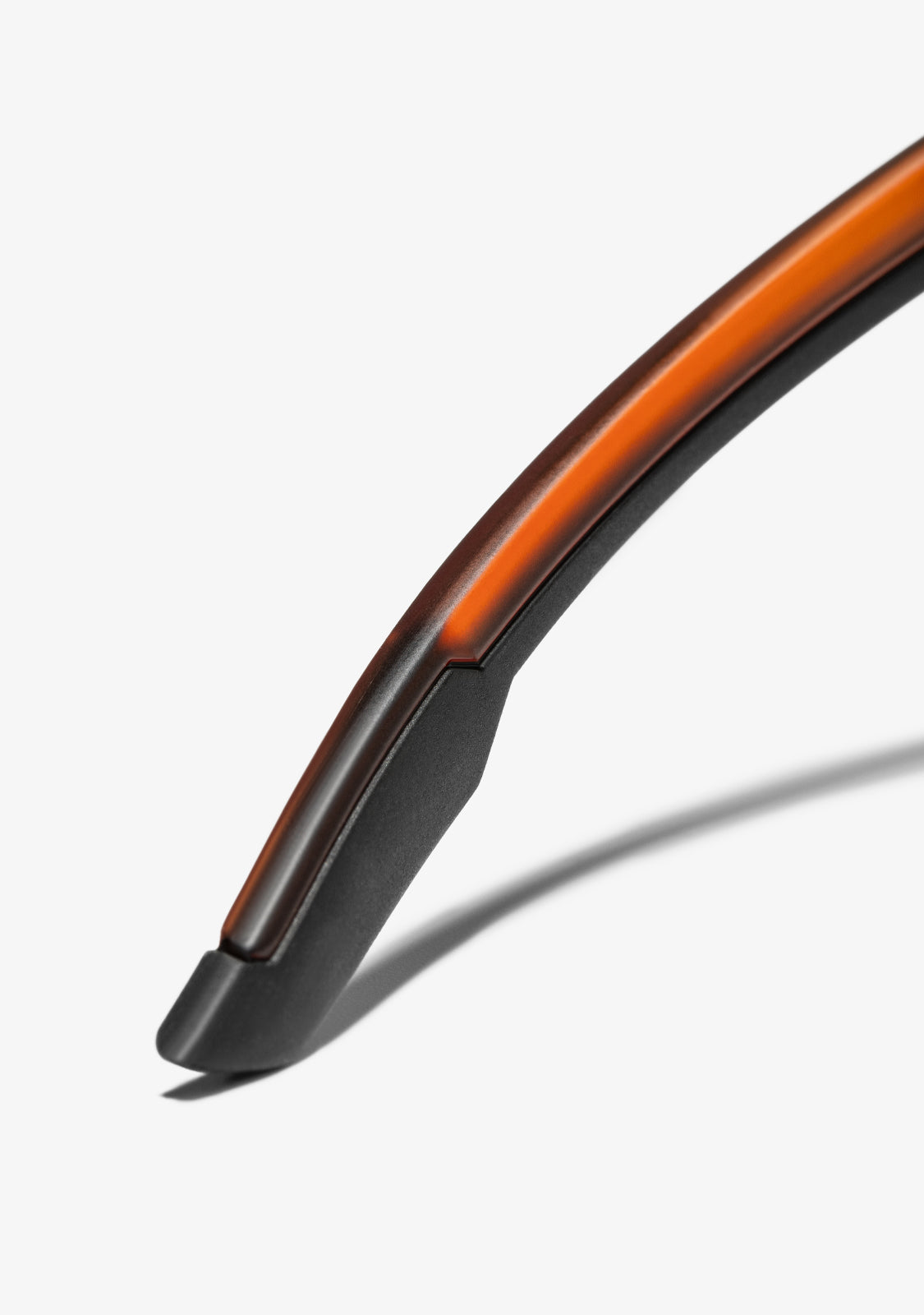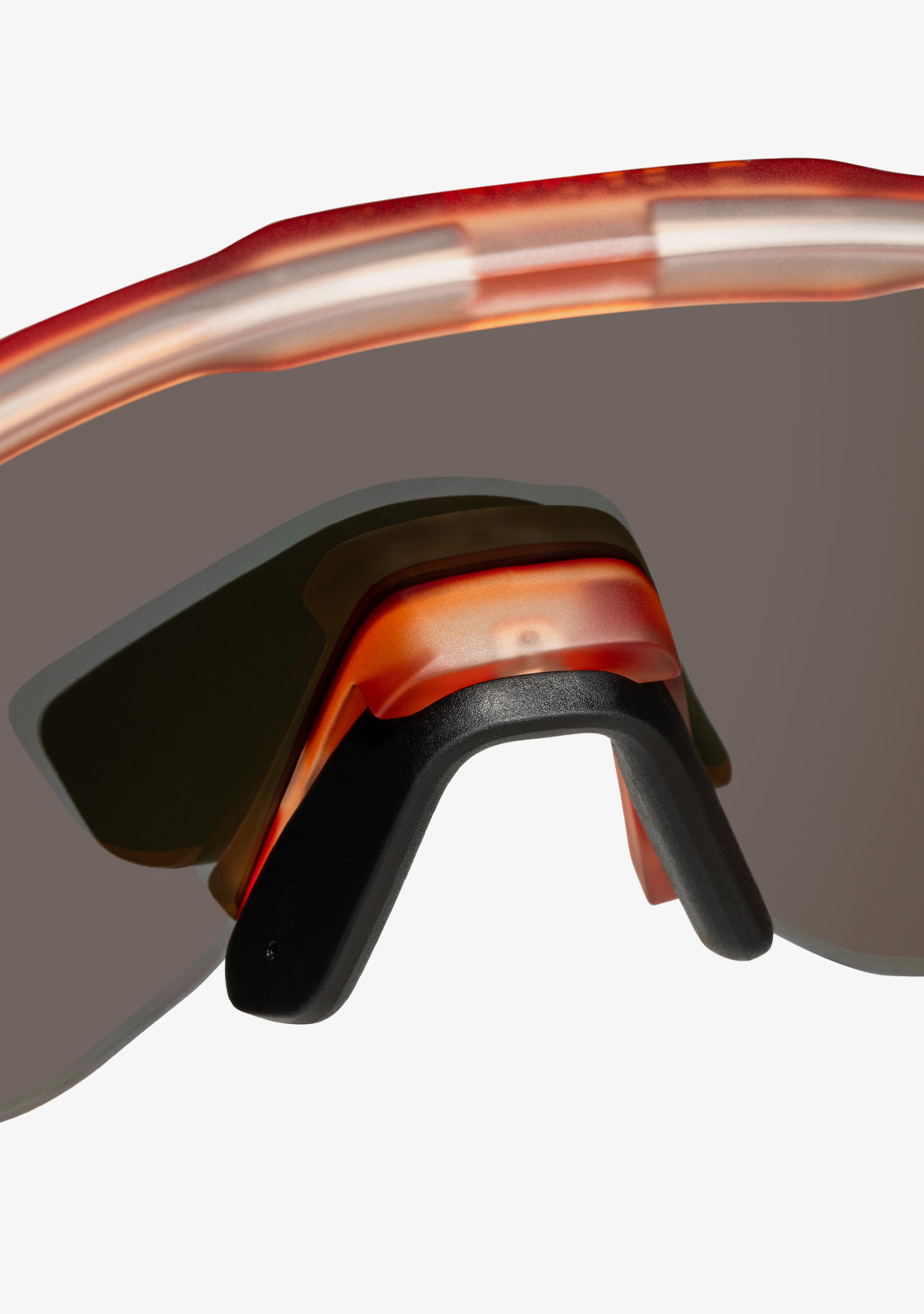 The Hurricane Red model features a bold reddish finish and an aerodynamic frame. It includes a 142 mm front and 152 mm lenses, precisely engineered to optimize wind flow and reduce resistance. The 140 mm temples showcase our emblem on both sides, while silicone pads on the tips and nose bridge ensure a stable, comfortable grip during any activity.