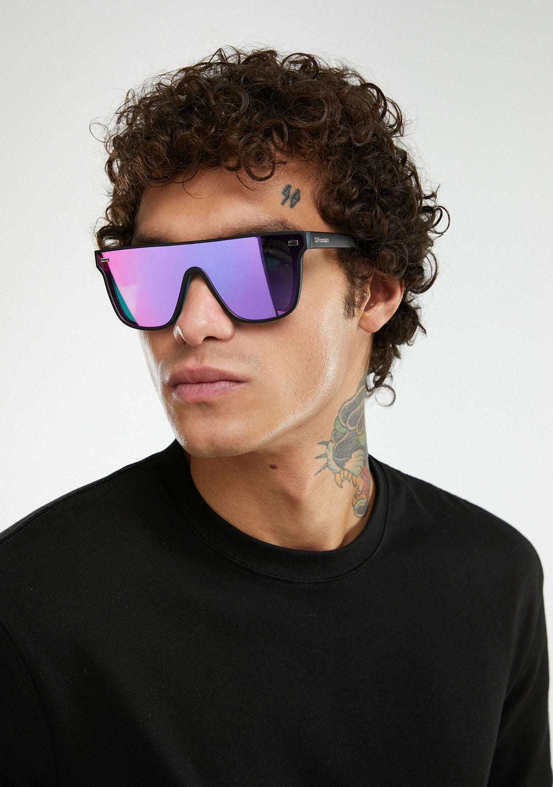 Pink polycarbonate lenses and matte black contours define the essence of its features. It features our signature D.Franklin details: the logo engraved on the front left and right sides and our emblem on both temples. With a lens width of 140mm and a 144mm front frame, these glasses enhance the features of any face. The side temples are 149 mm long and are made of hypoallergenic and resistant materials.