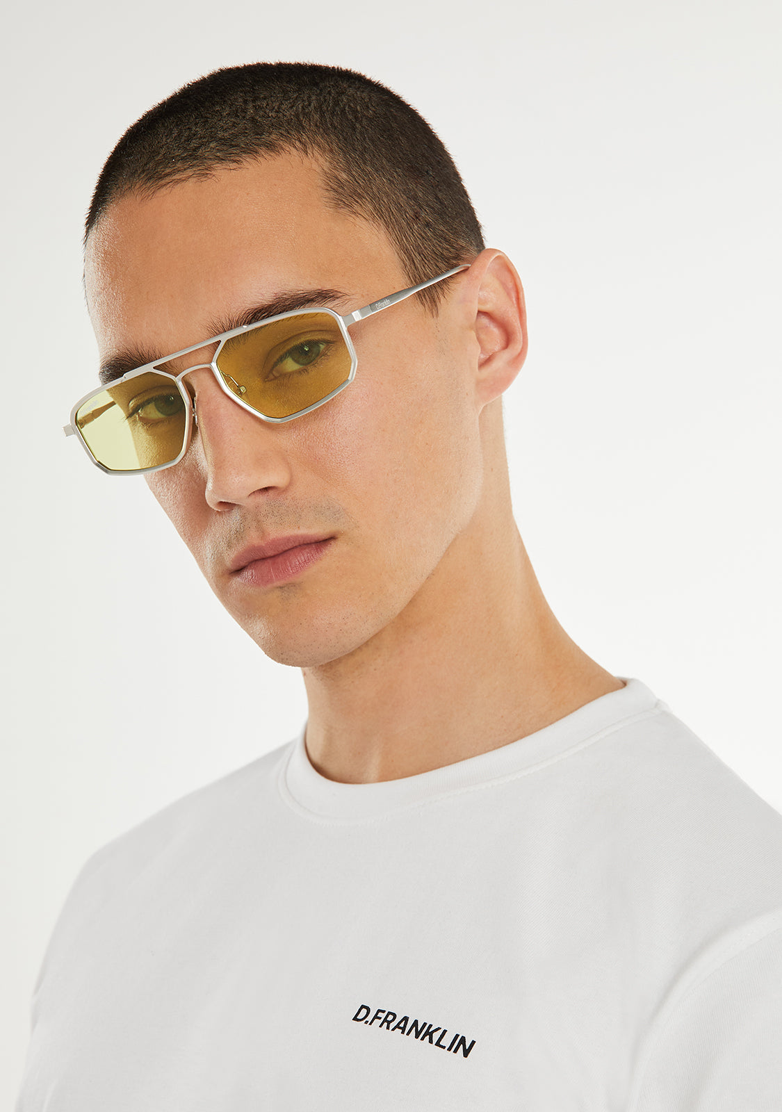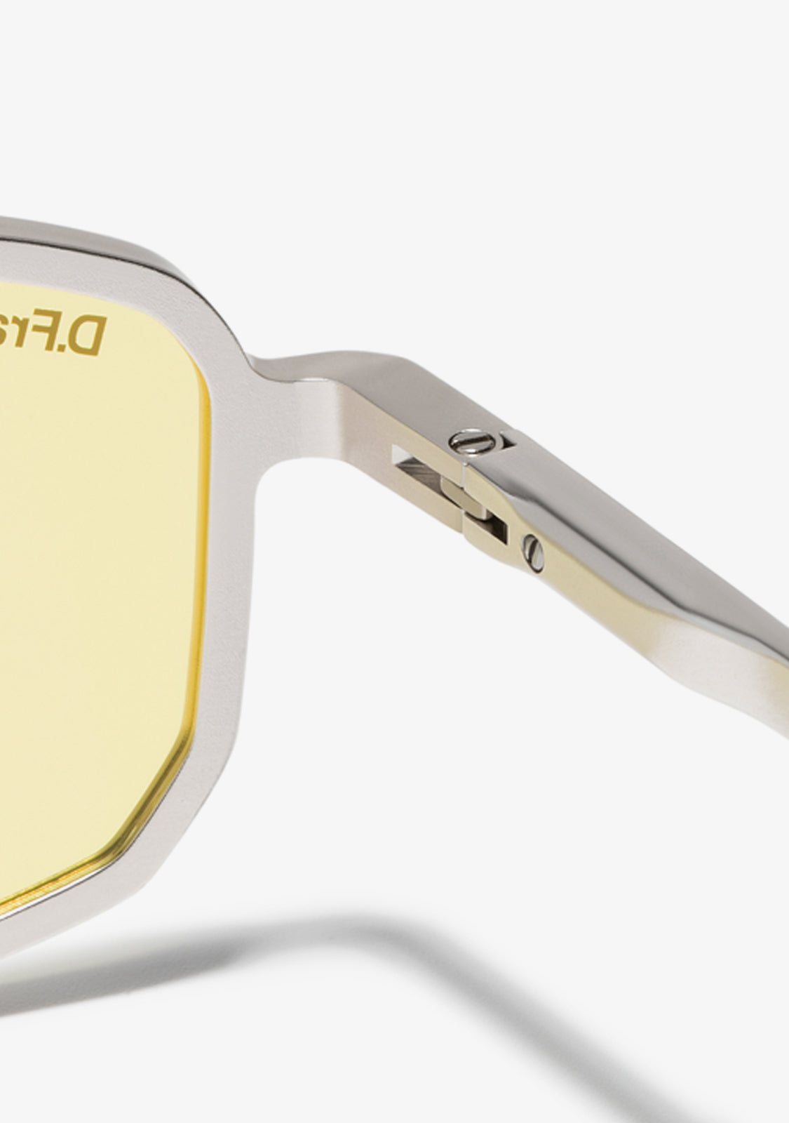 Thanks to their aluminium construction, these glasses are ultra-lightweight. They feature yellow polarized lenses and a silver frame that reinforces its signature aesthetic. The design features our emblem on the right lens and metallic logo on the side of the temples. It has a 143 mm front frame and a 52 mm lens width, which fits most faces. The temples are 138 mm long.