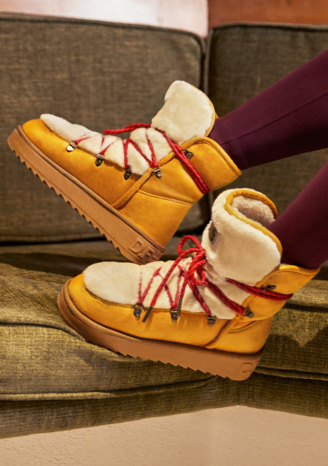These mustard boots feature high-quality microfibre fabric. The redesigned sole provides a lighter weight for a more comfortable ride. It also features our custom heel badge. Multi-position mountain-style laces provide optimal support and reflective detailing. Plus, a faux fur lining adds the ultimate winter touch.