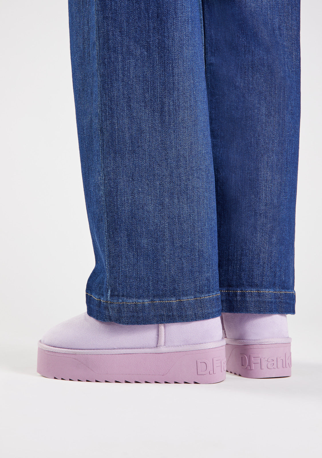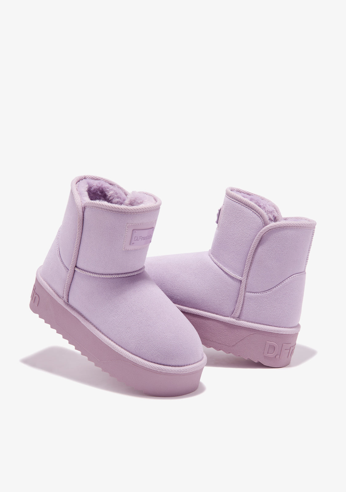 Asymmetrical cut design in lavender tone with synthetic inner lining for superior warmth.