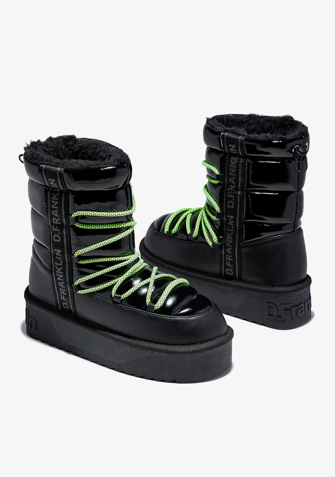 We define cold days with a warm and distinctive piece. This model is made with high-quality, lightweight, and flexible fabrics. Its double-height sole provides great comfort. Additionally, it features our custom emblem on both the heel and the side. Its green laces ensure a perfect fit and support and include reflective details.