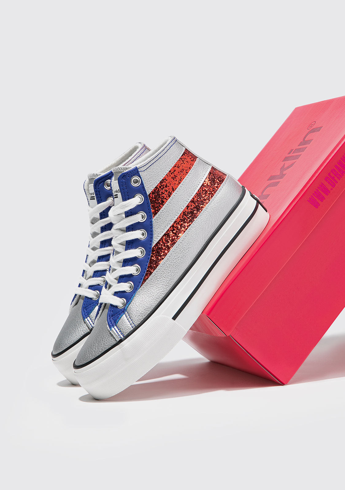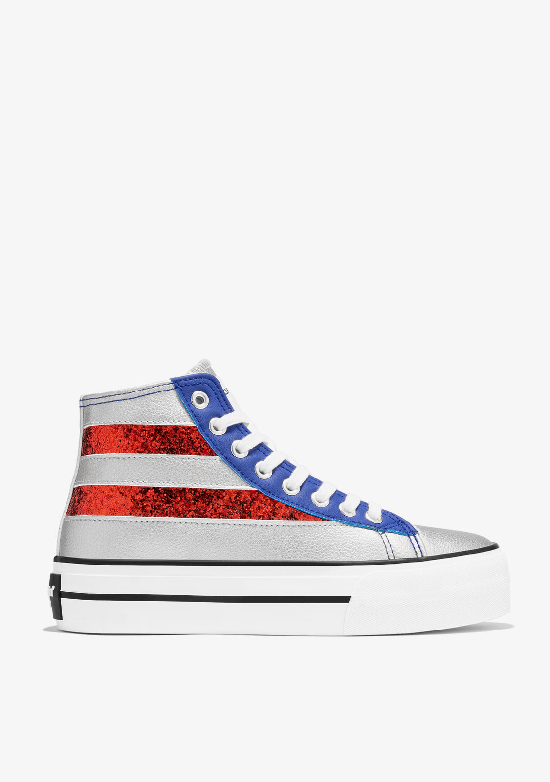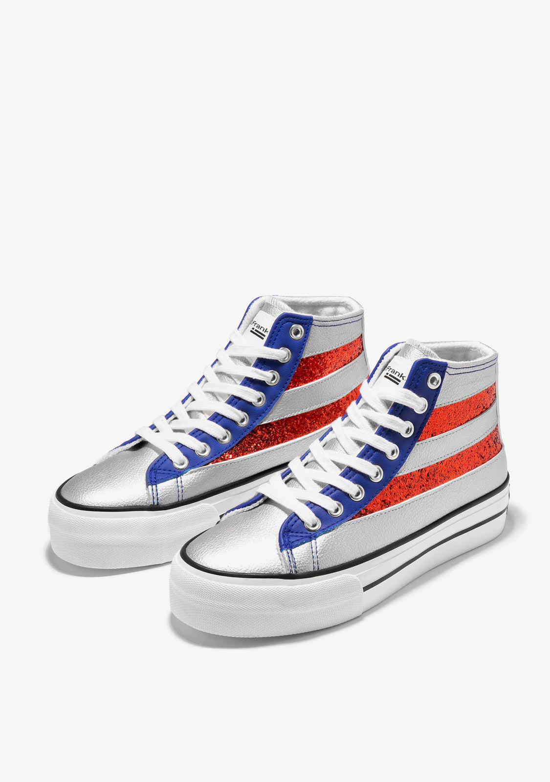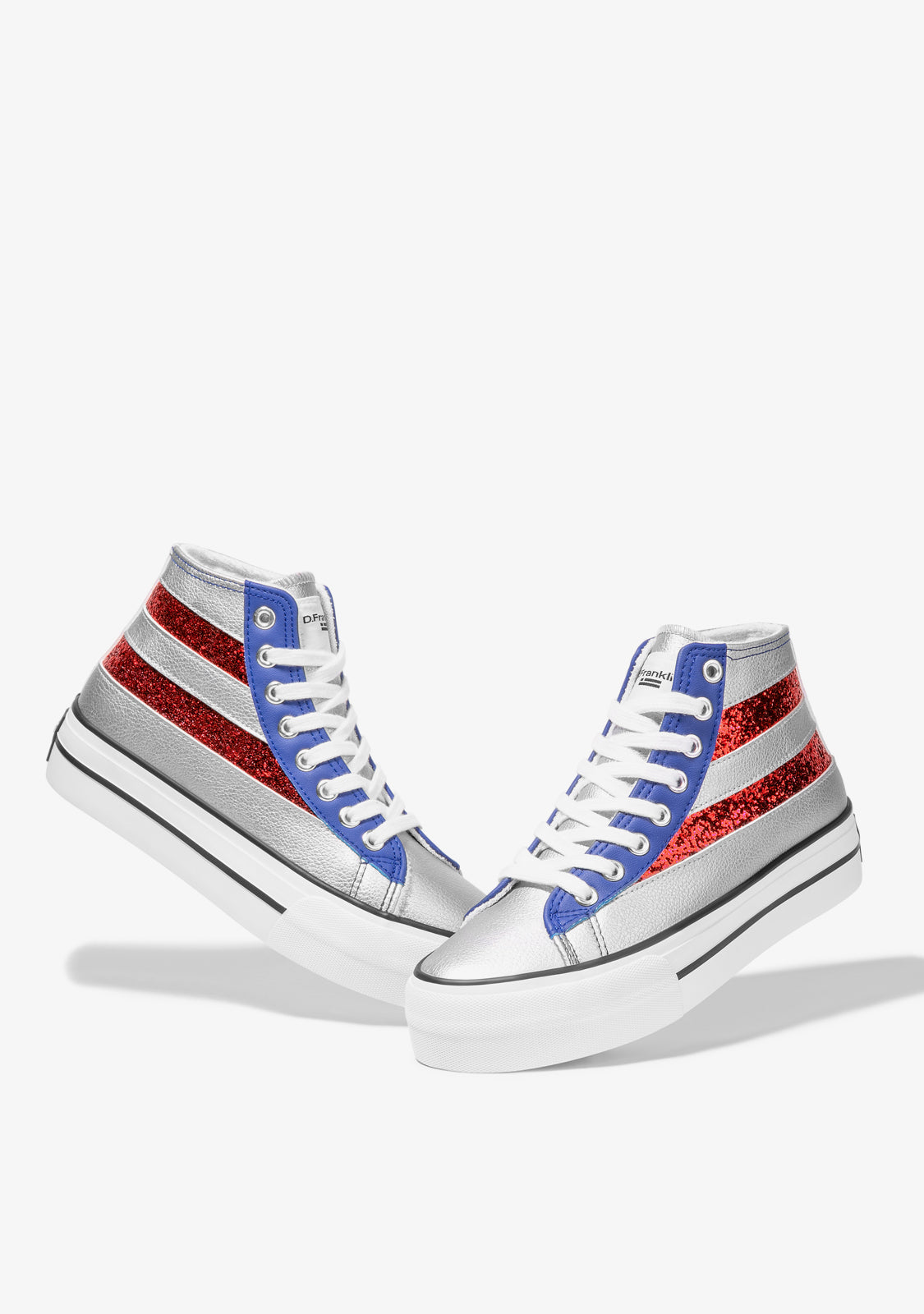 The One Way limited edition is inspired by the most casual collections, combined with the personality and the most marked style of D.Franklin®. The One Way Five Patch USA are the perfect Hi-top sneakers for all kinds of new roads. A street style model that combines current trends with original details of its materials. Made of black synthetic leather with a full flag design.