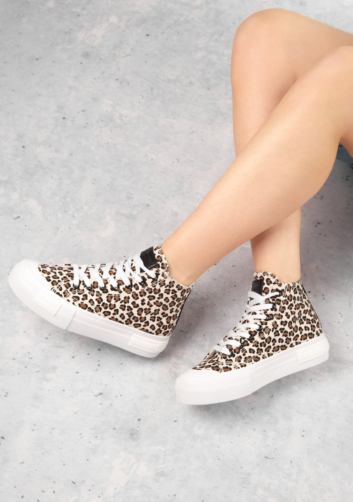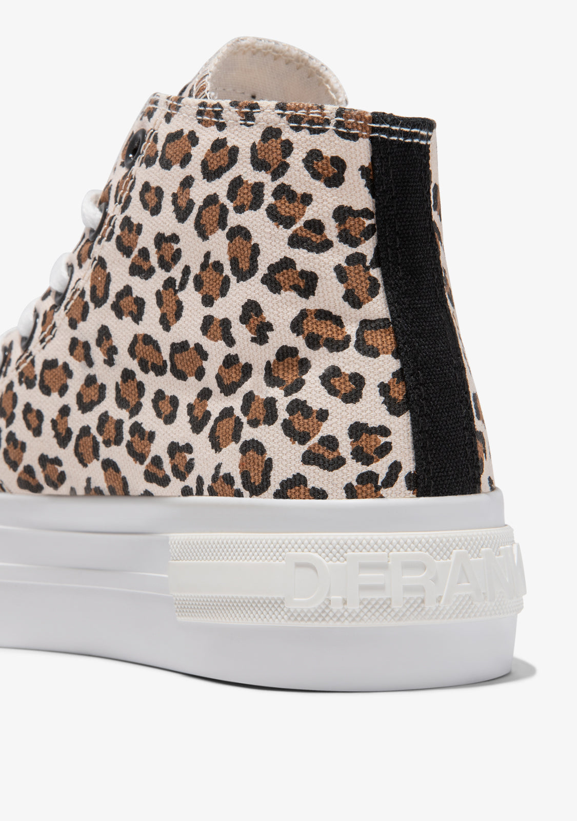 This ankle boot is constructed from canvas textile with a leopard print. White rubber sole and personalised lettering on the heel. It has a height of 4 cm and features our flag emblem on the side.