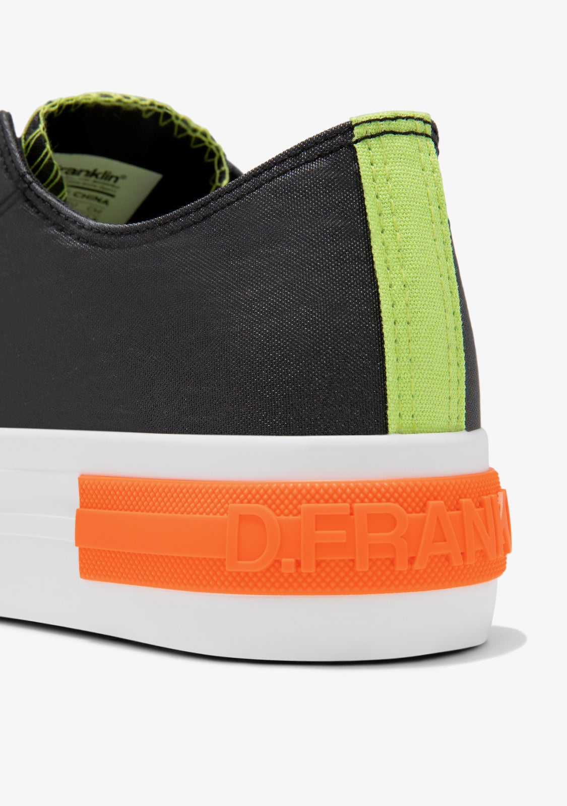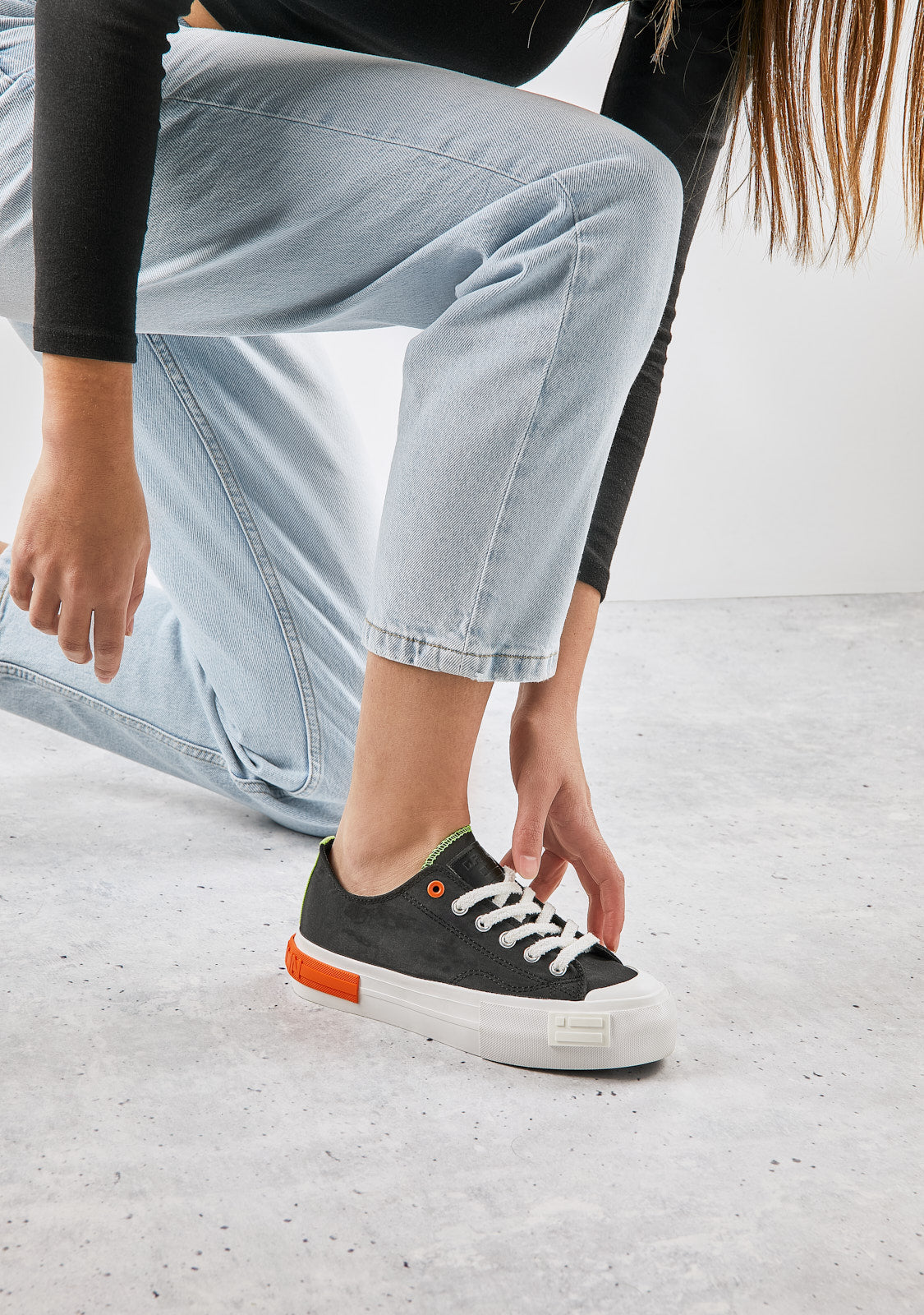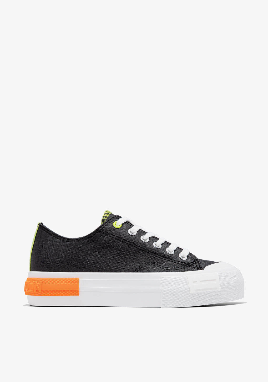 Our black One Way design is constructed from canvas textile. White rubber sole and orange lettering detail. Featuring a 4cm height and our flag emblem on the side.