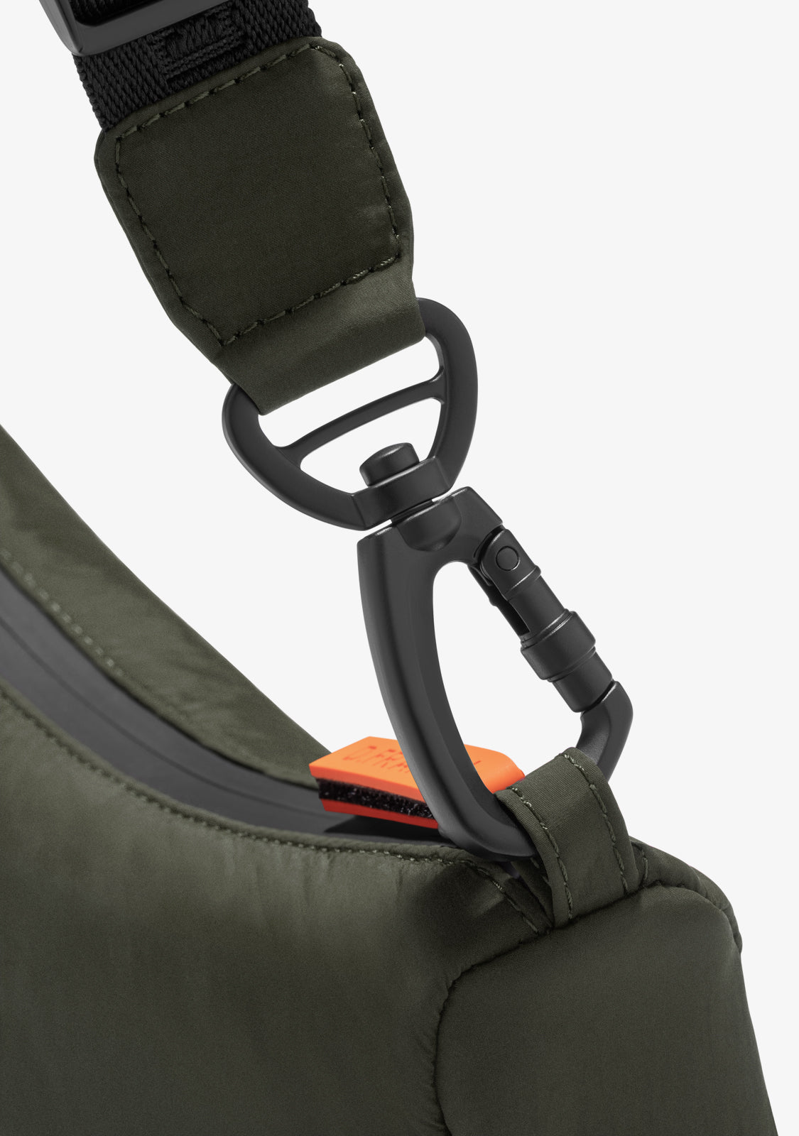 This green-finished design is crafted from technical materials that make it lightweight and durable. The interior features a zippered pocket and two small organiser compartments.