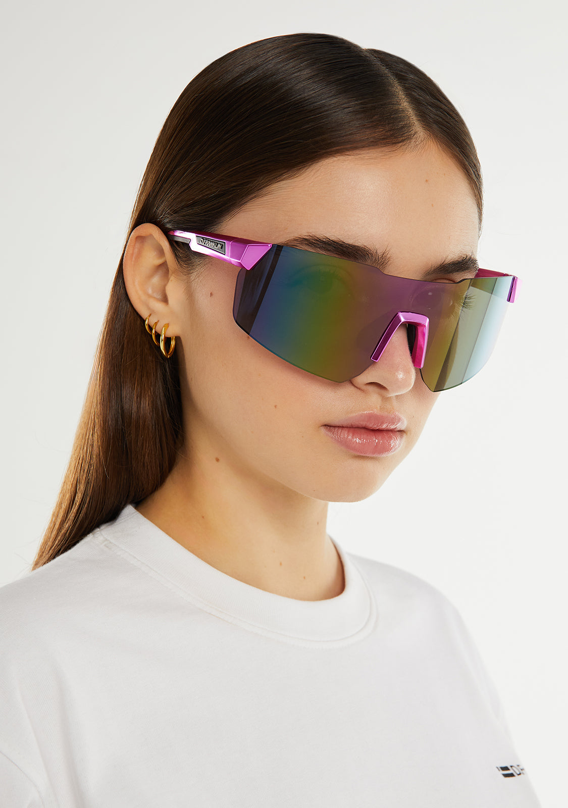 This model delves into the depths of the oceans with mirrored lenses without limits or frames. It has a fuchsia finish and features our signature emblem on the side of the temples. The uniform lens width is 145 mm and the temple width is 130 mm.