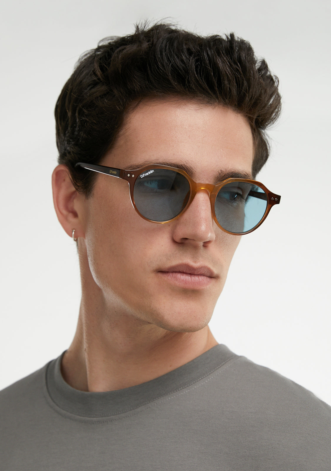 Its blue tinted acrylic round smoked lenses and TR90 frame in brown degrade highlight the timelessness of this model, with a unique touch. It features our distinctive D.Franklin details: the logo engraved on both metal temples and our emblem on the right lens. With a lens width of 47 mm and a front frame of 138 mm, these glasses flatter most faces. The side temples have a length of 145 mm.