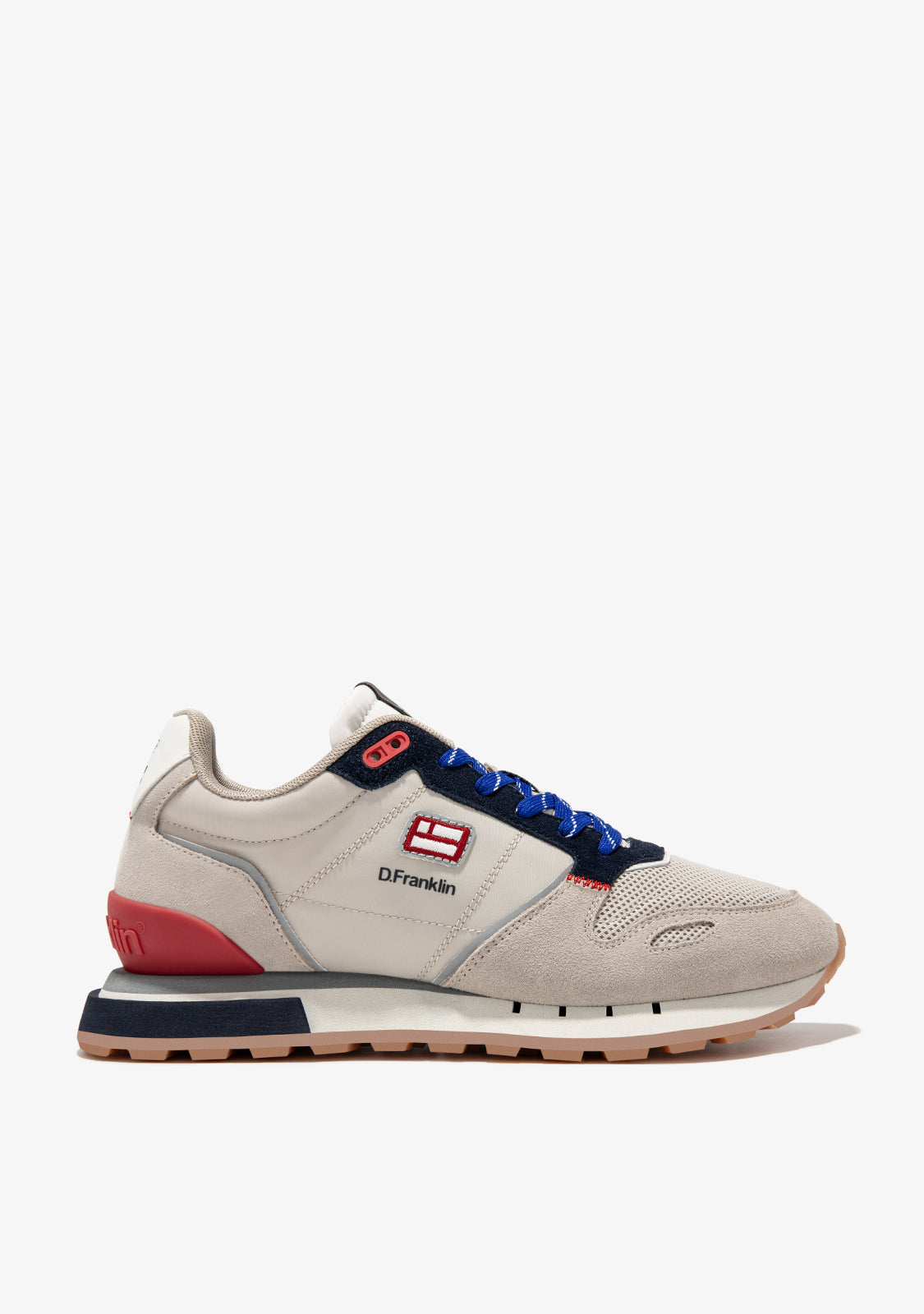 These sneakers are made with grey, navy and red details. They also feature blue printed laces. They have a TR sole and a pyramid outsole for enhanced comfort and traction. The toe area has a mixed toe piece for added flexibility. Our emblem can be found on the front and side as well as on the back.